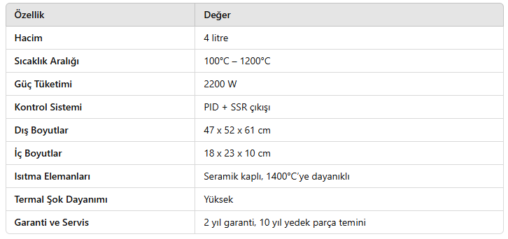 - Geniş Çalışma Aralığı: 100°C ile 1200°C arasında çalışabilir. Maksimum kullanılabilir sıcaklık 1100°C’dir.