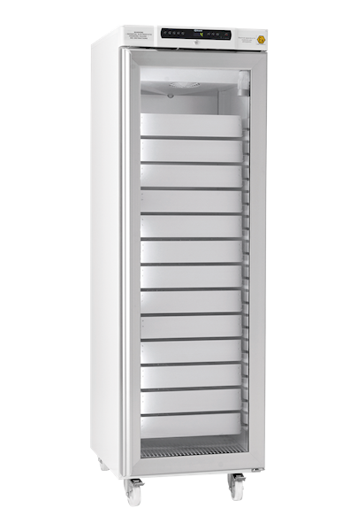 BioCompact II 410, bir buzdolabı RR (+ 2 ° C / + 20 ° C) ABS iç ve beyaz veya paslanmaz çelik dış ile birlikte gelir.